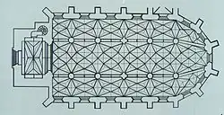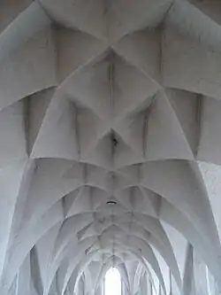 Das Zellengewölbe oder Netzgratgewölbe wird von zehn freistehenden achtseitigen Pfeilern getragen. Das Kreuzgewölbe der quadratischen Sakristei ist mit Birnstabrippen versehen.