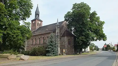Die heutige Kirche wurde im Jahre 1857 als Nachfolgebau von zwei einstmals hier befindlichen Vorgängerbauten eingeweiht. Sie ist ein massiver Saalbau aus Backstein, welcher mit Feldsteinen verblendet wurde. Im Osten des Kirchenschiffs wurde ein etwas niedrigerer dreiseitiger Chor angefügt. Im Westen ist ein Turm mit nahezu quadratischem Grundriss zu finden. Errichtet wurde das Bauwerk nach Plänen des Torgauer Bauinspectors Dolscius. Vom Baustil her wird die Kirche der Neugotik zugeordnet.[2][3][1]