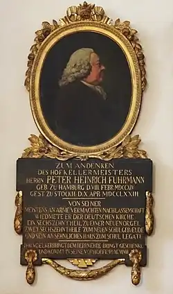 In der Sankt-Gertrud-Kirche befinden sich ein Epitaph und eine Büste Fuhrmanns. Sie wird einmal im Jahr anlässlich eines Stiftungsessens in einem Stockholmer Restaurant aufgestellt.[2] An dem von ihm der Kirche vermachten Haus wurde an seinem 150. Todestag, dem 10. April 1923, eine deutschsprachige Gedenkschrift angebracht.