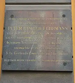 - ↑ Die Datumsangabe 31. Februar wird bei Susanne Blatt: Großzügiger Stifter: Peter Hinrich Fuhrmann. Gemeindeblatt der Deutschen St. Gertruds Gemeinde Stockholm Nr. 4/2014, S. 7 als nach dem damals verwandten Julianischen Kalender korrektes Datum behauptet.