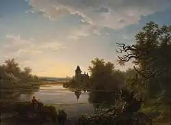 - A sunlit cottage near a pond, Öl auf Leinwand, o. A.