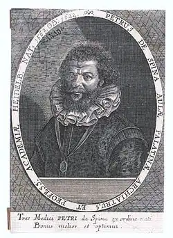 Peter de Spina II. studierte ab 1578 zunächst in Basel, ab 1580 in Jena, dann in Paris und ab dem 15. Juni 1585 in Padua. Im Jahr 1587 wurde er mit der Dissertation Kommen Atmung und Verdauung durch willkürliche oder unwillkürliche Bewegungen zustande? in Basel zum Dr. med. promoviert. Nach praktischer Tätigkeit als Arzt in Aachen von 1588 bis 1599, wo er auch Mitglied des reformierten Kirchenrats und Ratsherr war, musste de Spina die Stadt wegen der dortigen Aachener Religionsunruhen verlassen und kam 1599 als Leibarzt des Kurfürsten Friedrich IV. von der Pfalz nach Heidelberg. 1617 wurde er in Heidelberg Dekan der medizinischen Fakultät, zwei Jahre später Rektor. In Heidelberg musste er noch die Belagerung und Einnahme der Stadt durch den Feldherrn Tilly 1622 erleben, worauf er aus Kummer verstarb. Seine letzte Ruhestätte fand er in der Heidelberger Peterskirche. Peter de Spina II. galt als einer der renommiertesten Ärzte seiner Zeit. Sein Heidelberger Wohnsitz ging nach seinem Tod 1622 an seinen Sohn über.[1] Die Vita, die sein Biograf Balthasar Venator 1625 im Auftrag der Witwe und der Söhne verfasste, ist eine wichtige Quelle zur Geschichte Heidelbergs im Dreißigjährigen Krieg.