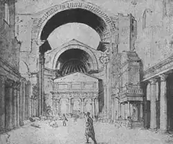 Bramante ließ in seiner Amtszeit die Vierungspfeiler mit ihren großen Nischen, die später zum Teil wieder abgetragene westliche Apsis und den sogenannten Tegurio, einen Schutzbau über dem Petrusgrab, errichten. Von seinen Entwürfen blieb die Idee der von vier mächtigen Pfeilern gestützten Kuppel, welche die Pläne der nachfolgenden Architekten tiefgreifend beeinflusste.[31] Das Vorgehen von Bramante wurde seinerzeit nicht nur positiv gesehen. So heißt es in einem 1517 veröffentlichten Traktat, er hätte „ganz Rom zerstört, wenn man ihn gelassen hätte“, und der anonyme Verfasser erhebt bittere Vorwürfe wegen der Vernichtung der mehr als tausend Jahre alten konstantinischen Basilika. Somit dokumentiert diese Quelle frühe Überlegungen in Richtung Denkmalschutz.