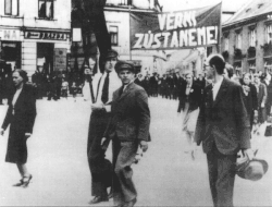 Am 15. Mai 1938 veröffentlichten führende Tageszeitungen in der Tschechoslowakei das Manifest „Věrni zůstaneme“ („Wir bleiben treu“), mit dem die tschechoslowakische Öffentlichkeit angesichts der drohenden Aggression durch das Deutsche Reich mobilisiert werden sollte. Das Manifest, das die Treue zu den Idealen der jungen Republik und zum Vermächtnis deren Gründers T. G. Masaryk postulierte, wurde initiiert und unterschrieben durch 308 bekannte meist linksgerichtete Intellektuelle, Wissenschaftler und Künstler, eine umfangreiche Unterschriftenaktion, die von mehr als einer Million Personen gezeichnet wurde, ist vom zu diesem Zweck entstandenen Ausschuss „Petiční výbor Věrni zůstaneme“ organisiert worden.[1]