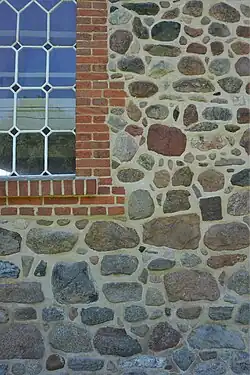 Die Kirche ist ein rechteckiger Backsteinbau mit dreiseitigem Chorschluss im Osten.[3] Der westliche Teil des Mauerwerks des Langhauses im Norden, wie auch im Süden, besteht zu weiten Teilen aus Feldsteinmauerwerk. Der östliche Teil mit Chorschluss ruht auf einem kleinen Feldsteinfundament, besteht sonst jedoch aus Backsteinen. Die Saalkirche besitzt einen wuchtigen dreigeschossigen Westturm. Das Dach des Westturms ist mit Schieferplatten gedeckt, das Langhaus besitzt hingegen ein mit bräunlichen Ziegeln gedecktes Dach.