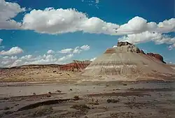- Rainbow-Forest-Bed, weiße schräggeschichtete Sandsteine und Konglomerate aus gerundeten Kieseln und Geröllen. In dieser Lage finden sich verkieselte Baumstämme. Sie bildet die abschließende Deckschicht am Blue Mesa, Agate Mesa und nördlich von Rainbow Forest.
