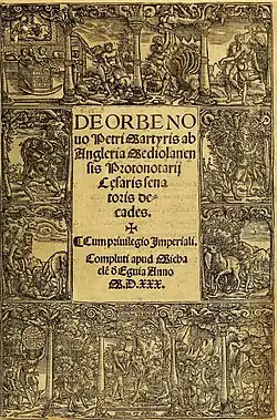 • De Orbe Novo Decades ist eine umfassende Beschreibung der Entdeckung Amerikas durch die Spanier. Die erste Dekade wurde ohne Petrus Martyrs Einvernehmen bereits 1511 in Sevilla gedruckt, die erste autorisierte Fassung (De Rebus Oceanicis et Novo Orbe) erschien hingegen erst 1516 in Alcalá. Eine frühe italienische Übersetzung der ersten drei Dekaden erschien bereits 1504 unter dem Titel Libretto de tutta la navigatione de Re de Spagna de le Isole et terreni novamente trovati bei Albertino da Lessona in Venedig, sie ging auch in die von Fracanzano da Montalboddo herausgegebene Anthologie Paesi novamente retrovati (Vicenza, 1507) ein. Die Übersetzung geht auf Angelo Trevisan, den Sekretär des venezianischen Botschafters am spanischen Hof zurück.[6]