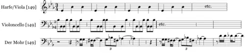 - Der Mohr: Die Stumpfsinnigkeit des Mohren wird durch den einfachen, ostinaten Rhythmus in Basstrommel, Becken und Streichern und durch die „dümmlich wirkende“[10] Melodie verdeutlicht.