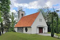 Der auf einem Hügel von der Straße abgerückte Kirchenbau wurde an der Stelle einer barocken 1785 profanierten und 1944 zerstörten Kapelle im Jahre 1964 erbaut.