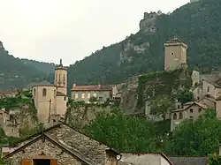 Das Wappen des Orts, drei goldene Tannenzapfen auf blauem Grund, ist das des Hauses Albignac.