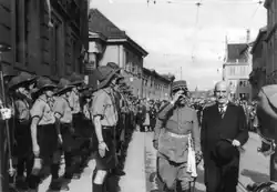 In den 1930er-Jahren stiessen militärische Formen in der schweizerischen Pfadfinderbewegung auf zunehmende Akzeptanz. Das Korps Stadt Zürich und die Abteilung Flamberg gelten als Ausgangspunkt dieser Entwicklung.[2] Sie fielen unter anderem deshalb auf, weil sie vom Pfadfindergruss zum militärischen Gruss wechselten, um ihre Verbundenheit mit der Armee zu unterstreichen.[3] Diese Entwicklung erfasste bald die ganze Pfadfinderbewegung und fand ihren Höhepunkt im Bundeslager 1938 auf dem Adlisberg in Zürich. Mit sportlichen Wettkämpfen und Massendemonstrationen wollte man beweisen, dass man einen guten schweizerischen Staatsbürger heranzuziehen vermochte. Am Nationalfeiertag zogen gegen 7000 Lagerteilnehmer in einem Defilee durch die Zürcher Bahnhofstrasse, vorbei an Persönlichkeiten aus Politik und Armee.