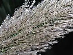 Der aufsteigend verzweigte, dichte rispige Blütenstand weist eine Länge von 30 bis 90 Zentimetern sowie einen Durchmesser von etwa 5,8 Zentimetern auf. Die 11 bis 14 Millimeter langen Ährchen enthalten zwei bis fünf Blüten. Die schmal lanzettlichen Spelzen sind ungleich und 8 bis 12 Millimeter lang. Die lanzettlichen Deckspelzen sind 8,5 bis 23 Millimeter groß und drei- bis siebennervig. Drei der Nerven bilden eine bis zu 1,5 Millimeter lange Granne. Die zweizähnigen Spitzen der Deckspelzen sind rückseitig mit 5 bis 6 Millimeter langen Haaren besetzt. Die Vorspelze (Palea) macht etwa die Hälfte der Deckspelze aus. Staubbeutel sind etwa 3 Millimeter lang.