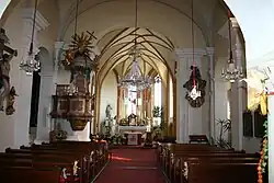 Die Turmvorhalle hat ein spätgotisches Sternrippengewölbe. Das vierjochige Kirchenschiff unter einem Tonnengewölbe hat kurze Stichkappen und eine Empore über einem Kreuzgratgewölbe, die Emporenbrüstung ruht auf zwei toskanischen Säulen. Am breiten rundbogigen Triumphbogen zum Chor sind Teile der gotischen Profilierung erhalten. Das Netzgewölbe des Chorbereichs ruht auf kapitelllosen Runddiensten.