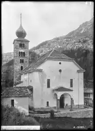 Die Kirche in St. Niklaus Dorf war das erste Gotteshaus im Nikolaital. 1272 wird urkundlich eine Kirche aufgeführt, die Nikolaus als Kirchenpatron geweiht ist. Wie Peter Josef Ruppen, der 1856 bis 1862 der Pfarrer von St. Niklaus war, berichtet, stand die Kirche immer an der gleichen Stelle.[18] Am 18. Juli 1965 wurde die heutige Kirche von Bischof François-Nestor Adam eingeweiht. Aus dem alten und grossen abgerissenen Barockbau wurden u. a. die Altäre in den Neubau übernommen. Im Landesmuseum Zürich befindet sich ein Altaraufsatz mit der Inschrift «Tod der Maria, aus St. Niklaus, Wallis, 1475».