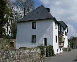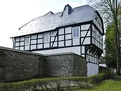 Die stattliche Barockanlage steht südlich der Kirche St. Gervasius und St. Protasius. Sie besteht aus dem Giebel- und Traufenhaus mit Walmdach und einem zweigeschossigen Erker, der mit 1645 bezeichnet ist. Über dem Portal ist ein Tatzenkreuzwappen angebracht. Seitlich davon steht das Giebelhaus mit einem Fachwerkaufsatz des 18. Jahrhunderts. Das Obergeschoss mit einem Knüppelwalmdach kragt vor. Bemerkenswert im Inneren sind das Treppenhaus, die Holzbalkendecke und ein Kamineinbau mit Grafschafter Wappen. Die Kreuzwegreliefs der Sieben Fußfälle an der Friedhofsmauer stammten aus der Zeit um 1700. Das Haus wurde 1964 umfangreich renoviert.[1]