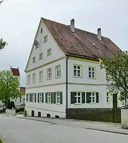Der zweigeschossige Bau mit Gesimsgliederung und Satteldach besitzt fünf zu vier Fensterachsen.