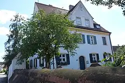 Der zweigeschossige Giebelbau mit Zwerchhaus und Putzgliederung besitzt vier zu drei Fensterachsen.