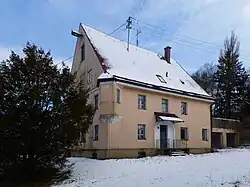 Der zweigeschossige Bau mit Satteldach und Eckerker besitzt drei zu zwei Fensterachsen.