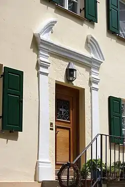 Der zweigeschossige Satteldachbau besitzt vier zu fünf Fensterachsen. Eine zweiseitige Freitreppe führt zum Portal, das von einem gesprengten Giebel auf Lisenen ruhend geschmückt wird.