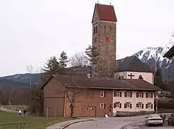 Pfarrhaus in Stein im Allgäu, dahinter die Pfarrkirche St. Mauritius