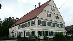 Der zweigeschossige Satteldachbau mit Putzbandgliederung besitzt sechs zu fünf Fensterachsen.