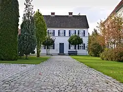 Der zweigeschossige Satteldachbau besitzt ein umlaufendes Sohlbankgesims.