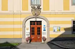 Über dem Torbogen ist das steinerne Doppelwappen des Stiftes Garsten und von Abt Konstantin Muttersgleich zu sehen. Beide Wappen verbindet als unterer Rand die Jahreszahl 1730 in römischen Ziffern.