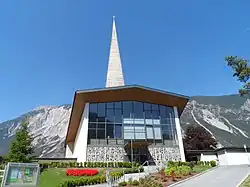 Die Kirche steht auf einem Schuttkegel der Ötztaler Ache. Erbaut wurde die Kirche von 1962 bis 1964 nach den Plänen der Architekten Sepp Salzburger und Wilhelm Adamer. Die Einrichtungen Ambo, Tabernakel und Taufbecken wurden in Beton nach Entwürfen des Künstlers Herbert Barthel[1] gebildet. Die Betonglasfenster schuf 1964 die Glasmalerin Inge Höck. Die Kreuzwegstationen sind Werke des Malers H. Stilhard.