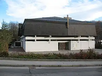 St. Josef ist ein schlichter, turmloser Kirchenbau über einem rechteckigen Grundriss. Der Innenraum mit Empore und Rupertikapelle wird durch seitliche Fensterbänder belichtet.[4] Die Kreuzwegstationen wurden vom Absamer Bildhauer Karl Obleitner junior aus Keramik geschaffen.