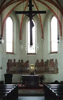 Die barocke Einrichtung wurde 1945 zerstört. Der heutige schlichte Volksaltar und der Tabernakel entstanden um 1947. Im Chor ist ein monumentales Hängekruzifix mit einem Korpus aus der zweiten Hälfte des 17. Jahrhunderts.