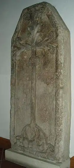 • Romanische Grabplatte, oben trapezförmig schließend, um das zweite Viertel des 13. Jahrhunderts, mit Relief, Kreuzstab mit lilienförmig sprossenden Kreuzarmen auf einem Kleeblatthügel, innerhalb des Hügels ein vierbeiniges auf dem Rücken liegendes Tier.
