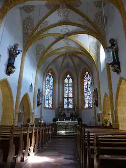 Der siebenjochige Innenraum zeigt eine offene Ordnung, d. h. je ein Joch des Mittelschiffes entspricht einem solchen des Seitenschiffes. Alle Joche sind kreuzrippengewölbt. Der ungewöhnlich tief sitzende Chorbogen (zwischen viertem und fünftem Joch) scheidet die Architektur des Raumes. Vermutlich umfasste der romanische Vorläufer nur das bis hierher reichende Mauerwerk des Mittelschiffes, während die restlichen drei Joche und der Altarraum im letzten Jahrzehnt des 14. Jahrhunderts angebaut wurden. Beide Seitenschiffe waren noch im 16. Jahrhundert um zwei Joche kürzer; an der Nordseite befand sich die 1502 geweihte Kapelle zu Ehren der hll. Andreas, Wolfgang und Ursula, im südlichen Seitenschiff waren die Josefskapelle sowie die Sakristei untergebracht. 1638 wurden diese auf die gegenwärtige Länge erweitert. Dabei wurde der unter der heutigen Sakristei gelegene Zugang zu der kleinen Krypta unter dem südlichen Seitenschiff vermauert, sodass diese zugeschüttet werden musste. Auch die Dekorationsmalereien im Gewölbe der Kirche stammen aus dieser Zeit.