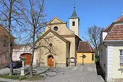 Als sogenannte Josephinische Saalkirche zeigt sich die Kirche mit einem schlichten lisenengegliederten Langhaus. Südseitig hat die Fassade einen geschweiften Blendgiebel und ein Rundfenster und seitliche Rechteckfenster. Die monumentale Vorhalle hat eine übergiebeltes Rundbogenportal und Rechteckfenster. Der Nordturm mit Ecklisenen hat rechteckige Schallfenster und einen Pyramidenhelm. Die Sakristei mit einem Aufgang zum Turm steht nordwestlich am Chor.