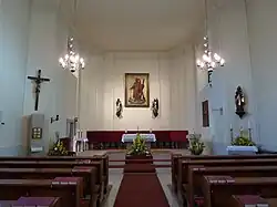 Das Kircheninnere zeigt sich mit einem Langhaus und einem etwas erhöhten, leicht eingezogenen Chor mit Flachdecke und lisenengegliederten Wänden.