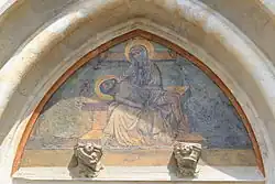 Das Westportal mit reich profiliertem Gewände, und um 1400 entstandenen gotischen Konsolenengeln wurde 1884 renoviert. Dabei wurden die seitlichen Fialen, das gotische Pietàgemälde im Tympanon und das Maßwerk der drei Rundfenster in der Westfassade umgestaltet. Auch das spitzbogige Südportal stammt aus dieser Zeit. Am nördlichen Strebepfeiler der Westfassade ist der römerzeitliche Grabstein des P. Aelius Tertullus und der Maxima Secunda eingelassen. An den Seiten des Grabsteins sind auf Relief ein Satyr und eine Mänade dargestellt. An der Nordwand der Kirche befindet sich ein weiterer römerzeitlicher Grabstein für Commodius und Commodinus, gestiftet von Finitus, dem Sklaven des Claudius Priscus. Aus dem Frühbarock stammen die beiden Grabsteine an der Westfassade mit den Motiven der Kreuzigung und der Auferstehung.