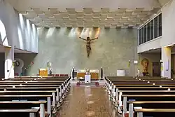 Den Kirchenraum dominiert ein großes Kruzifix der Holzschnitzkunst von Peter Sellemond. Der Tabernakelstein aus Krastaler Rauchkristall stammt vom Bildhauer Günther Kraus. Georg Zauner gestaltete Relief, Kreuzweg und Taufstein. Die Orgel wurde von 1978 bis 1980 durch die Oberösterreichische Orgelbauanstalt St. Florian errichtet und verfügt über 19 Register auf 2 Manualen und Pedal.[3] Die Fassade wurde 1996 von Arik Brauer gestaltet.[4]