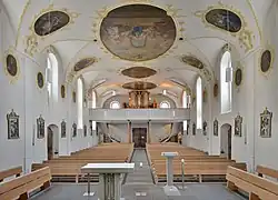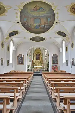 Die Kirche hat einen eingezogenen Chor mit Fünfachtelschluss mit flachem Gewölbe und Stichkappen. Das rechteckige Langhaus hat eine Flachdecke mit gedrückten Hohlkehlen. In diese schneiden über den vier rundbogigen Fenstern jeweils Stichkappen ein. Die tiefe vorgezogene Empore lagert auf dünnen Holzstützen, die Brüstung ist durch Zwergpilaster und Felder geschmückt. Die Wände in Chor und Langhaus sind durch Pilaster schlicht gegliedert. An den Decken ist reiche Stuckornamentik von 1730, bestehend aus Voluten, Kartuschen, Rosen und Zweigen, die die architektonische Gliederung begleitet. Die Wandbilder schuf Johann Kaspar Rick im Jahr 1862. Die Deckenbilder in Vierpassform zeigen von Westen begonnen die „Anbetung der Heiligen Drei Könige“, den „zwölfjährigen Jesus im Tempel“, das „Pfingstwunder“, das „Letzte Abendmahl“ sowie die Auferstehung Jesu. In den Hohlkehlen befinden sich ovale Bilder mit Darstellungen verschiedener Heiliger: links die heilige Barbara, der heilige Augustinus, der heilige Evangelist Matthäus sowie der heilige Evangelist Johannes; auf der rechten Seite die heilige Katharina, der heilige Johannes der Täufer, der heilige Evangelist Lukas sowie der heilige Evangelist Markus. Franz Bertle schuf 1862 in die Wand eingelassene Rundbilder, im Langhaus stellen sie die zwölf Apostel, im Chor die vier Kirchenväter.