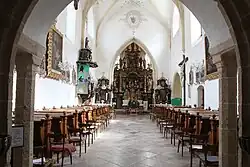 Der frühbarocke Hochaltar von 1686 mit einem dreigeschoßigen Aufbau ist reich mit Statuen und vergoldeten Ornamenten besetzt. Die Seitenaltäre stammen aus der 17./18. Jahrhundertwende, wobei der nördliche Seitenaltar mit einer spätgotischen Steinmensa ausgestattet ist.