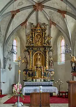 Das einschiffige, zweijochige Langhaus hat ein Sternrippengewölbe. Die Langhausmauern sind romanisch mit halb eingezogenen Strebepfeilern mit halbkreisförmigen Diensten. Die dreiachsige Westempore hat ein Kreuzgratgewölbe. Der einjochige Chor mit einem Fünfachtelschluss hat ein Sternrippengewölbe. Der schlanke Westturm trägt eine barocke Haube. Die Sakristei hat ein Netzrippengewölbe.