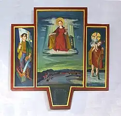 Über der Tür zur Werktagskapelle hängt ein von Franz Weiss gestaltetes Tafelbild, das in seiner Form an einen Flügelaltar erinnert. Das Bildnis war von Weiss ursprünglich als Altarbild für die neugebaute Kirche entworfen worden. In der Mitte des Bildes steht die heilige Barbara, die Patronin der Kirche, auf einer Wolke über dem Werkgelände der Grube Oberdorf. Flankiert wird sie von den beiden Heiligen Christophorus und Florian.[5]