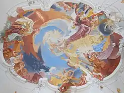 Der Saalraum des Langhauses unter einem flachen Stichkappentonnengewölbe hat keine Wandgliederungen. Der Chor zeigt gemalte Wandgliederungen mit Pilastern und einem stark profilierten Gesims mit Zahnschnitt- und Eierstabfries. Dabei wurden die Fresken von Karl Selb aus dem Jahr 1792 durch Johann Kärle übermalt. Die Fresken von Kärle wiederum wurden 1929 von Toni Kirchmayr übermalt. Die Fresken von Toni Kirchmayr zeigten im Chorgewölbe Mariä Himmelfahrt, am Chorbogen Mariä Verkündigung, im Langhausgewölbe Mariä Heimsuchung und die Geburt Christi, die Darbringung des Herrn, den zwölfjährigen Jesus im Tempel und über der Orgelempore ein Engelkonzert. Von 1991 bis 1994 wurde die Kirche rebarockisiert, dabei wurde von Wolfram Köberl die Arbeit von Toni Kirchmayr mit neuen Fresken übermalt.