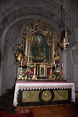 Der Hochaltar wurde unter Verwendung älterer Teile zusammengesetzt. Die Steinmadonna vom Anfang des 15. Jahrhunderts in der Mittelnische wird von einer barocken Engelsgloriole umgeben. Diese Statue gilt als das qualitätsvollste Beispiel einer „Schönen Madonna“ in Kärnten und ist wahrscheinlich ein Werk eines Salzburger Künstlers. Die beiden Seitenfiguren der Heiligen Anna und Joachim wurden um 1740 von Hans Patterer geschaffen. Auf der Tür des aus St. Athanas stammenden Tabernakels ist eine Kreuzigung von Josef Ferdinand Fromiller dargestellt, die Seitenflügel geben die Apostel Petrus und Paulus wieder.