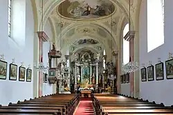 Die marmorierte Einrichtung entstand nach der Mitte des 18. Jahrhunderts. Der Hochaltar – die Chorrückwand einnehmend – mit Neuerungen aus dem 19. Jahrhundert hat einen mächtigen Säulenaufbau mit leicht einschwingenden dreisäuligen Seitenteilen mit den Statuen Sebastian, Zacharias, Elisabeth, Johannes Nepomuk. Das Altarbild aus der zweiten Hälfte des 19. Jahrhunderts und in einem barockisierenden Rahmen stellt den Johannes der Täufer dar. Die Deckenfresken mit Szenen aus dem Leben des Kirchenpatrons, der Heimsuchung Mariens, der Namensgebung Johannis, der Taufe Christi und der Enthauptung des Johannes, wurden 1777 von Franz Zoller geschaffen.[1]