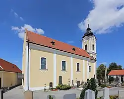 Die Kirche steht im Nordosten des Ortes als nördlicher Abschluss eines Straßenplatzes erhöht auf einer Geländestufe und ist von einem ummauerten Friedhof mit einem Karner umgeben. Die spätbarocke Saalkirche hat einen Ostturm am Chorhaupt und einen nördlichen Sakristeianbau.