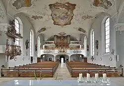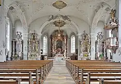 Das flachgedrückte Stichkappengewölbe des dreijochigen Langhauses ruht auf Wänden mit Stuckkapitellen ohne Pilasterauflage. Die niedrigen, querschiffartigen Seitenkapellen sind mit Gurtbögen auf Wandpfeilern zum Langhaus geöffnet. Ein eingezogener, rundbogiger Triumphbogen verbindet Langhaus und Chor. Der zweijochige Chor mit 3/8-Schluss hat Rundbogenfenster. Die Doppelempore im Langhaus ruht auf vier Steinsäulen über dreiachsigen Bogenstellungen.
