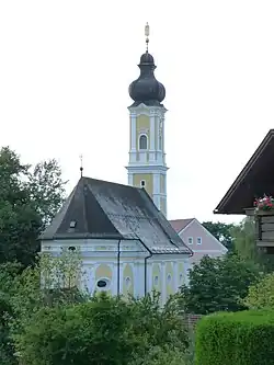 Die ehemalige Kapelle aus 1651 bis 1656 bildet die Sakristei. Die Kirche wurde von 1667 bis 1668 mit dem Baumeister Christoph Zuccalli erbaut. 1735 wurde der Westturm erhöht. Die untere Empore ist aus 1668, die obere Empore aus 1715.