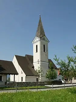 Die Pfarrkirche mit einem Langhaus unter einem Satteldach mit einem eingezogenen Chor mit geradem Abschluss unter einem niedrigeren Satteldach hat einen Turm und eine zweigeschoßige Sakristei im Norden.