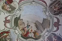 Die Wandmalereien schuf 1829 Christoph Brandstätter. Im Mittelfeld des Chores ist die Enthauptung der heiligen Margareta zu sehen, in den Zwickelmedaillons Szenen aus dem Leben der Heiligen. In den Langhausgewölben sind die Kreuzauffindung und die Kreuzeserscheinung Kaiser Konstantins dargestellt. Das Wandgemälde an der nördlichen Chorwand stammt aus dem späten 15. Jahrhundert und zeigt die Kreuzabnahme mit den Heiligen Margareta und Barbara. Die darüber befindliche Himmelfahrt Mariens entstand um 1600.