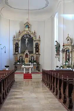 Das Kircheninnere zeigt ein Langhaus mit einschwingenden gerundeten Ecken und einen leicht erhöhten Chor mit einem gerundeten Schluss. Langhaus und Chor haben Wände mit einer einheitlichen Lisenengliederung und Flachdecken über einer Kehlung. Die östliche Orgelempore steht auf Gusseisensäulen. Das pilastergerahmte Portal zur Sakristei hat eine Steinrahmung. Das Turmerdgeschoß hat ein Platzlgewölbe.