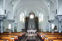 Im Chor befinden sich farbige Glasfenster von Anton Lehmden von 1975. Der Hochaltar besteht aus einem spätbarocken Aufbau mit Doppelsäulen und einem Volutenkranz rund um ein Ovalfenster. Seitlich sind zwei Figurengruppen aus Stuck aus dem vierten Viertel des 18. Jahrhunderts von Michael Minich, links die „Opferung Isaaks“, rechts die „Aufrichtung der ehernen Schlange“. Die Mittelgruppe aus 1826 stellt die Kreuzigung Jesu dar. Der Taufstein stammt aus dem 18. Jahrhundert, das Orgelgehäuse aus dem Jahr 1820. Die Orgel aus 1995 wurde von Herbert Gollini errichtet, wobei das Positiv von Philipp König stammt und das Hauptwerksgehäuse rekonstruiert wurde.[1]